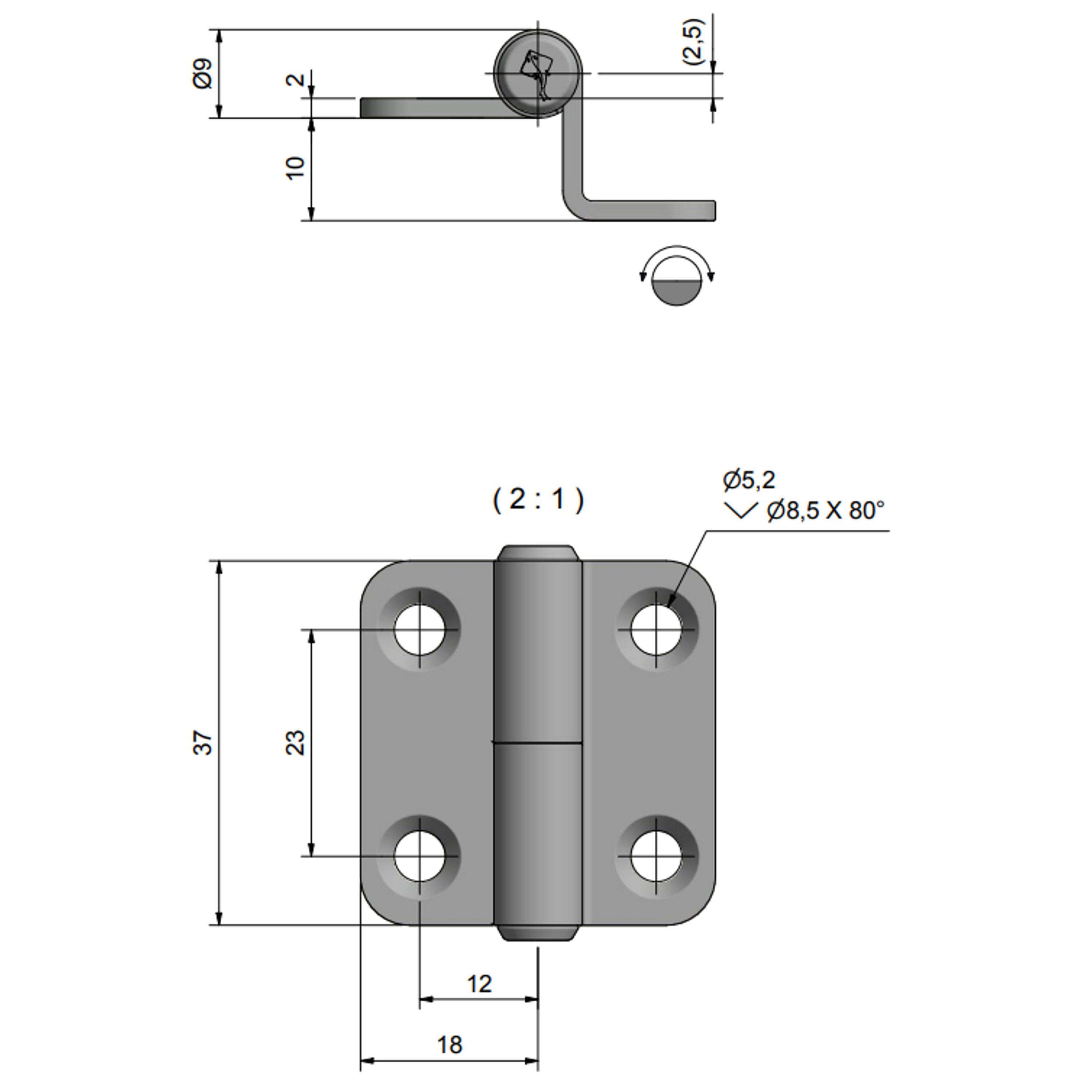 Forskudt dørhængsel fremstillet i rustfrit stål jvf. AISI 304. 38x37x10mm.